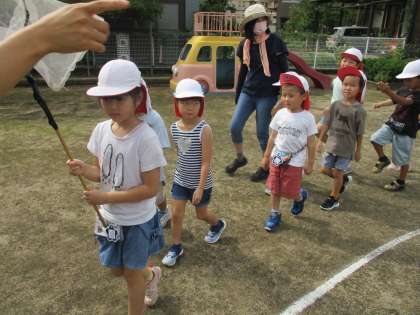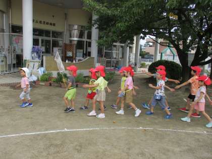 運動会に向けて赤団・白団に分かれ、園庭のトラックを行進しました。「足を上げて手を振って歩く」ということを意識して、歩きました。行進してみると「前の人と間を空けながら歩くこと」「手を大きく振ること」が難しいことに気づき、「お家の人にかっこいいねと言われたい」と張り切る子供たちでした。