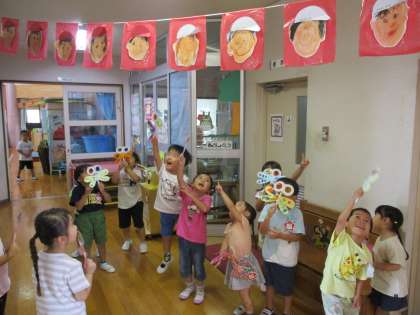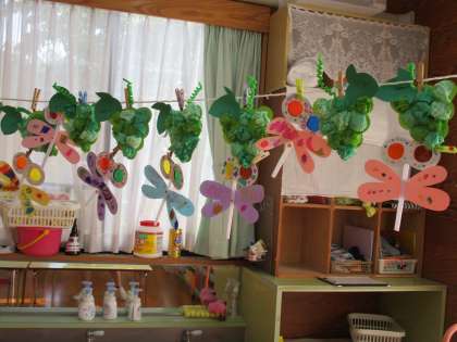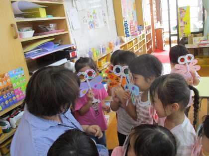 とんぼのメガネ(りす組) 公開日 2022/09/12 更新日 2022/09/12 今日のできごと 9月12日(月) とんぼのメガネが完成し、園内を飛び回ったり、メガネ越しに見たりしました。運動会に飾る旗を見つけると大喜びの子供たちでした。また、園長先生にメガネの完成を見せつつ、メガネを顔にあて「私は誰でしょう?」とクイズを出し「〇〇ちゃん!」と言われると、嬉しそうに顔を見せていました。 先週つくったマスカットと並べて飾ると、メガネのセロファンが透けてとてもきれいでした。