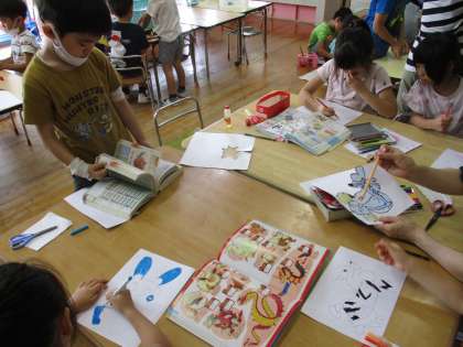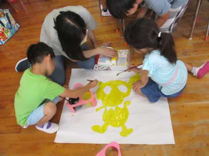 「どんな加技走にするか」の話し合いで、1学期にぞう組で楽しんできた「ポケモンひみつの島」を運動会の加技走の競技にして取り組むことになりました。「りすさんたちは電気の線をくぐれるかな」「トンネルは通りたいね」「ボーリングにしてポケモンを倒そう」とタイプ別に考えた遊びをイメージし、競技に使うアイテムを考えてつくっています。