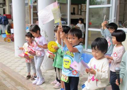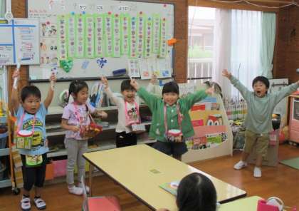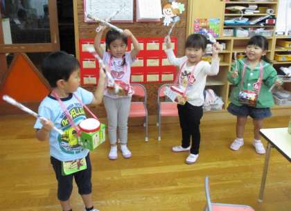 運動会の活動を通し、年長組、年中組の鼓隊やフラッグ演技や競技を見る機会が多く、チラシの棒を使って真似をしている友達が増えてきました。今朝から、空き箱では太鼓、塗り絵をフラッグにして遊び始めました。すると、年長さんが練習をしている音が園庭から聞こえたので、慌てて自分の作ったグッズを持って見に行きました。りす組はチラシ棒でバチ打ちをしたり、フラッグを振りながら足踏みしたり音楽に合わせて楽しんでいましたよ。「運動会って楽しいね」と、みんなで思いを共有し本番まで気持ちを高めています。