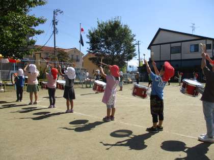 今日も秋晴れの下、運動会に向けての活動です。毎日「綱引きの作戦考えたよ」「今日こそ勝ちたいな」「リレー、今日も勝負だ!」「玉入れは絶対勝つ!」と気合の入った様子や鼓隊の様子を撮影したビデオを自分たちで見て反省し「昨日できなかったけど、音をそろえるのを皆で頑張るよ!」と自分たちのまだ出来ることを考えて鼓隊練習に取り組む姿も見られます。