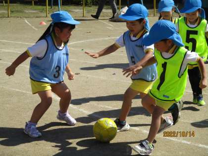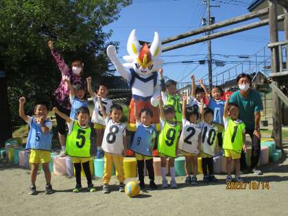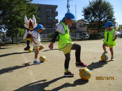 富山県サッカー協会からコーチが来園し、サッカーの基本の動きやルールを教えてもらいました。今回のサッカー教室には、ポケットモンスターの「エースバーン」というキャラクターが来て、ポケモンが大好きなぞう組や応援に来ていたりす組さんも大喜びしていていました。うさぎ組は、エースバーンと一緒にサッカー教室に参加することができました。最初に、サッカーで相手がいない場所に移動できるように、コート内で友達がいない広い場所を目指して歩きました。ボールを足でとめたり、蹴ったりするときのポイントを教わり、初めてサッカーをする子も「できた!」「シューとが決まったよ」と喜んでいました。最後に、試合を行い、ボールを必死に追いかけ、シュートが決まるとチームの友達のハイタッチをして喜び合っていました。子供たちはサッカーが大好きになったようです!幼稚園で、日頃の遊びの中でもみんなで楽しんでいきたいと思います。