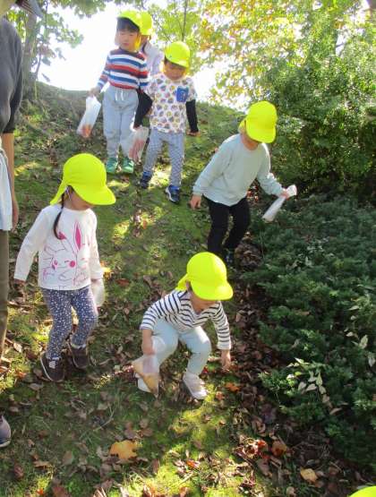 今日は、全園児で「スポーツプラザ」へ散歩に行きました。雲ひとつない気持ちのいい青空に、子供たちの心もウキウキでした。スポーツプラザ付近にはどんぐりがたくさん落ちていて、まるで宝物を見つけたかのようにあちこち目を向けて拾っていました。帽子だけ集めたり、赤ちゃんどんぐり、緑色どんぐりだけ、といろいろな種類を集めていた友達もいました。国道沿のイチョウの木も黄色に色づき、青空とマッチしていてとても素敵でした!