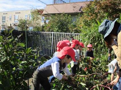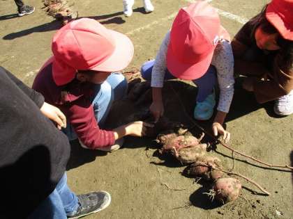 幼稚園の畑のサツマイモを掘りました。「どれくらいできているのかな」「大きいお芋できているかな」と楽しみにしていた子供たち。長く伸びたつるを「よいしょ」と力いっぱい引っ張り、土から顔を出したつるの先を手で掘りました。だんだん芋が大きく見えてくると「もう少し」「かたくて掘れない」と友達と楽しく掘る姿が見られました。また、傷つけないようにそっと宝物を掘り当てるように慎重に張る姿も見られました。