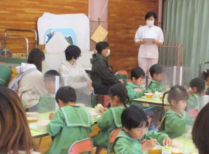 初めに、速星幼稚園調理員の紹介と挨拶がありました。調理員さんのお話の中には、野菜は3度洗いしていることや、生で食するトマトやキュウリは塩素消毒した後、流水でしっかり洗い流していることをお話されました。おいしい給食を頂ける裏には調理員さんや、栄養士さんの安心安全に提供するための努力や配慮、たくさんの手間と思いが込められているということを知ることができました。3日間とも、保育を参観し学んだ後は、給食参観をしてもらいました。給食試食会や給食参観もコロナ禍で3年間中止となっていました。アンケートでは、「箸やお茶碗を持って上手に食べていてびっくりした」「栄養士さんが月1回、食育指導をして下さるのは子供たちにとってすごく良いことだと思う」「野菜が苦手なのに食べていて驚いた」など、たくさんの感想が寄せられました。