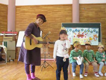 お楽しみコーナーでは「ゆきみだいふく」さんによる楽しいミニコンサートがありました。誕生児を祝ってもらい一人ずつポーズを決めたり、太鼓の音を聞いて手拍子をしたりしました。また、ゆきみだいふくさんの話す内容をしっかり聞いて応答すると「速星幼稚園の子供たちは上手だね」と褒めてもらいました。ギターやウクレレで演奏されるのを興味深く見ている子もいましたよ。