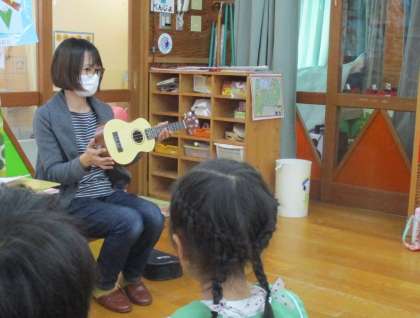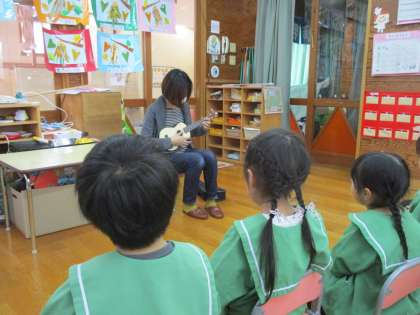 今日は、PTAのお母さんの「読み聞かせ」がありました。絵本と紙芝居を読んでくださった後、お母さんが趣味で楽しんでいる「ウクレレ」を子供たちに演奏してくれました。発表会で歌う「いぬのおまわりさん」もみんなで歌って楽しい時間となりました。