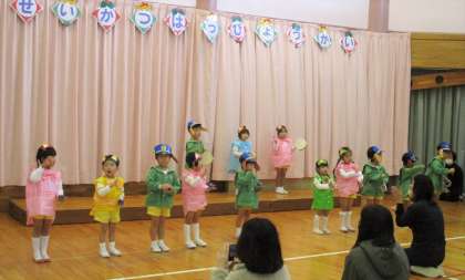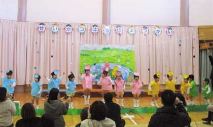 初めての生活発表会!運動会のようにお家の方が見に来てくれることを喜んで楽しみにしていた子供たちです。少し恥ずかしさや会場の雰囲気にもドキドキしたようでしたが、これまでみんなで楽しんできた劇ごっこや、歌、楽器遊びを嬉しそうに披露していました。自分の役の言葉や、みんなで言うところ、役になりきった表情や仕草、身振りなどよく頑張って表現していて可愛かったです!