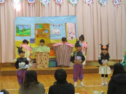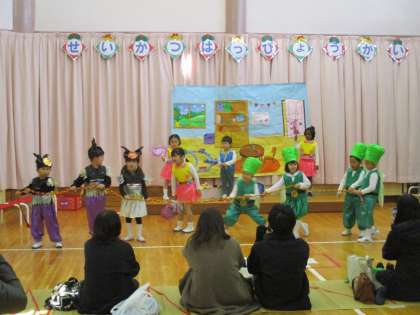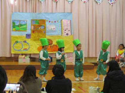 プログラム2番は、劇遊び「グリーンマントのピーマンマン」をしました。自分の台詞を大きな声で言ったり、友達が演技しているときも一緒に歌ったりとみんなとっても頑張っていました。発表会が終わり、お家の方から「頑張っていたね」「とても上手だったよ」とたくさん褒めてもらい、嬉しそうな子供たちでした。