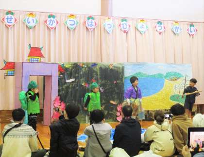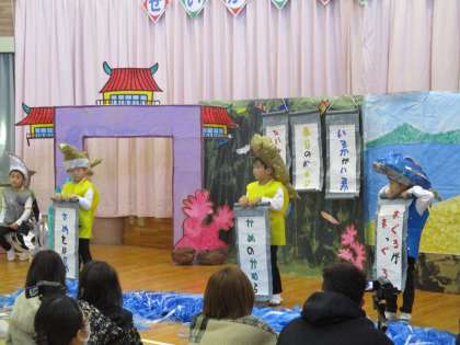ぞう組最後のプログラムは劇「うらしまたろう」です。役の台詞以外にも波の音や小道具を出す役割、ナレーターの役割なども担当する中、一人一人がよく頑張ってくれました。それぞれの役になりきって長い言葉を話すのも年長組らしい姿でした。