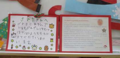 などが書かれていました。それを聞いた子供たちは、「え、来れないの?」と、驚くやら、びっくりするやら…でも「プレゼントが届く」と聞いて、ほっと安心するやら…。