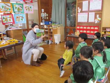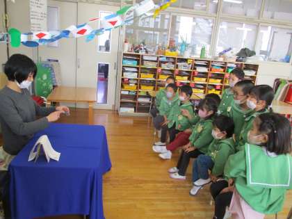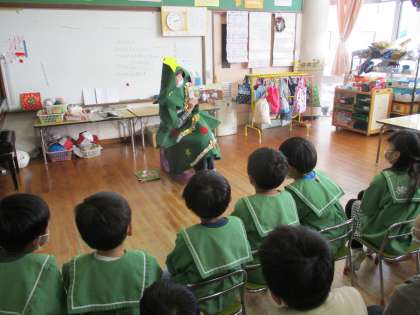 今日はPTAさんの読み聞かせがありました。りす組は仕掛け絵本「とびらをあけたら」やクリスマスのお話を読んでくださいました。子供たちは仕掛け絵本から何が出てくるのかと、ドキドキしながら見ていました。うさぎ組は手品を披露してくださいました。手の中に入ったコインを移動させたり、箱に入ったすごろくの目を当てたりと、子供たちは「え!どうして!」「すごい!」ととても驚き、夢中になって見ていました。ぞう組は、保護者の方がクリスマスツリーに変身して登場し、子供たちは「ツリーだ!」と喜んでいました。年長児が好きなダジャレが入ったクリスマスの絵本を読んでくださいました。