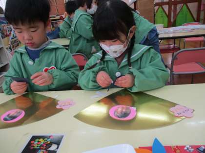 お正月飾りで扇をつくりました。扇の台紙に自分の写真や来年の干支のうさぎ、飾りを貼って素敵に仕上げています。新年に向けて保育室に飾りたいと思います。