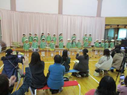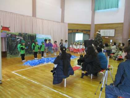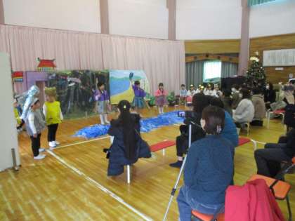 年長組の生活発表会をしました。ぞう組24人そろっての発表会ができました。「友達と一緒にするのは楽しいね」「楽しい発表会だ」と嬉しそうに話す子供たちでした。浦島太郎の劇の始まりはお客さんがいっぱい来てくださったことに、少し緊張した様子でしたが、お話が進んでいくうちに大きな声でセリフを言ったり楽しく踊ったりと笑顔いっぱいの発表会になりました。