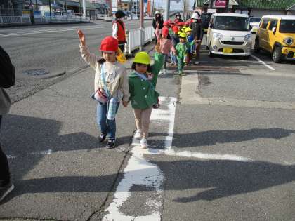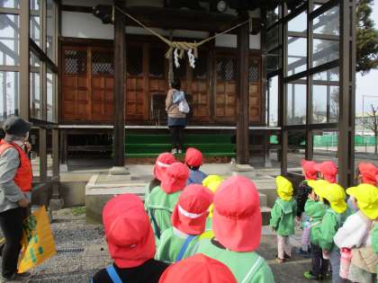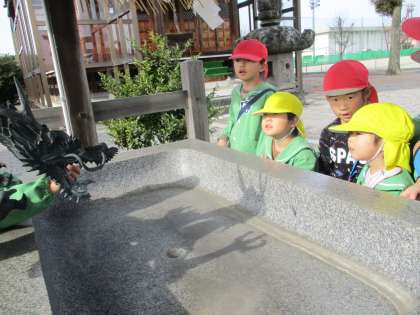 年長児と年少児で幼稚園近くの板倉八幡宮まで初詣散歩に行ってきました。年長児に「あと幼稚園でみんなで散歩に行けるのも何回かな」「りすさんとは何回行けるかな」と話していました。「お天気もよいので今日、りすさんとお散歩へ行こう!」ということになり、今年最初の散歩になるので、散歩コースにある神社へ初詣のお参りに行くことにしました。散歩の道中は年長児は年少児と手をつなぎ車の確認や道路の端を歩くことなど知らせながら歩きました。歩いている途中には坪野川を見て「鮎放流したね」と思い出を話す姿も見られました。神社に着くとみんなで二礼二拍手一礼をし、それぞれに神様に気持ちを伝えてきました。境内の中の鳥居や狛犬、手水舎の水が流れ出る口の龍を見たりと探索もしてきました。帰り道にはお家の庭先の雪囲いを見てることできました。冬ならではの季節の様子も感じることができました。