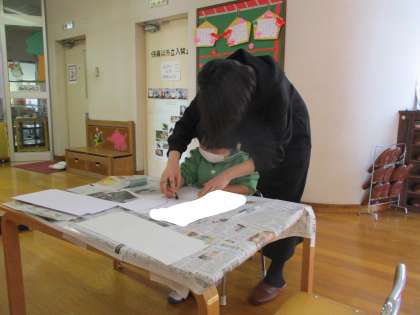 先日のぞう組の書初め教室に続き、うさぎ組も地域の書道教室の先生から自分の名前の書き方を教わりました。前日に郵便ごっこで自分の名前を書くことに挑戦した子供たち。先生に文字の正しい書き順やとめたり、はねたりするポイントを教えてもらいました。1枚目は先生に手を添えてもらいながら一緒に書きました。先生からアドバイスをもらい、2枚目は一人で書いてみました。書初めに挑戦して「自分の名前をかっこよく書けた」「もう自分で書けるよ」と嬉しそうに話していました。