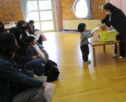 最後は、園長先生から入園許可証とお土産をもらいました。返事をしてくれた友達や「ありがとう」と伝えてくれた友達もいて嬉しく思いました。4月からは速星幼稚園の友達に仲間入りです。4月の入園式まで少し時間がありますから、お近くにお越しの際はお立ち寄りくださいね。