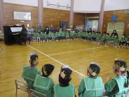 お楽しみコーナーでは、ピアノの演奏を聴きました。知っている曲だと分かると歌詞を口ずさんだり、ニコニコと体を揺らしたりしながら楽しんでいる姿が見られました。長く連なった楽譜、たくさんの指を動かして弾いておられるのを間近で見ていた子供たち。また「ピアノを弾いているときが楽しいです」と、演奏してくださった方が言われた言葉から、様々なことを感じてくれたら、と願っています。