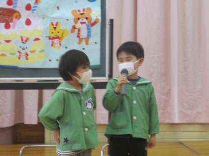 誕生会では、毎月、年長組が司会をしています。みんなの前で話すのは少しドキドキするようですが、毎月、友達と順番に話し、進行してくれています。
