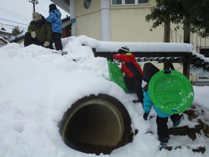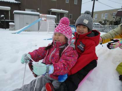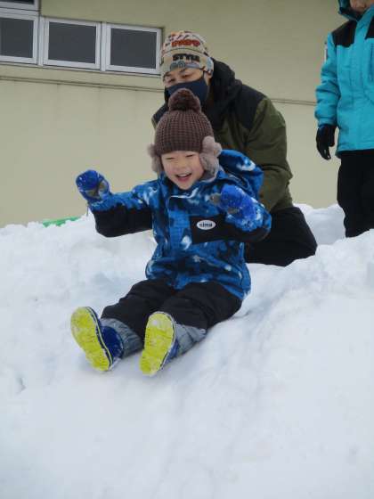 雪の滑り台ができたね!(4歳児 うさぎ組) 公開日 2023/01/28 更新日 2023/01/28 今日のできごと 1月27日(金) 園庭のアスレチックや泥山に雪が積もり、自然の滑り台ができていました。早速、そりに乗って滑ってみました。「きゃ〜、楽しい!」「もう一回しよう」と繰り返し楽しんでいました。アスレチックの雪の滑り台では、高さもあるので少し怖さを感じる子もいましたが、先生や友達の楽しんでいる姿を見て「やってみる」と挑戦する姿が見られました。