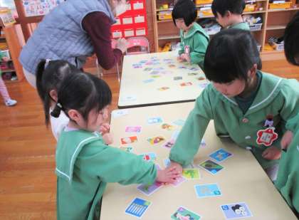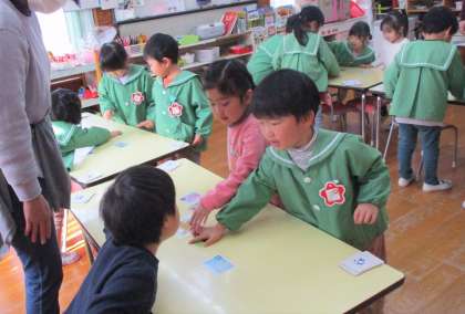 1月から楽しんでいる「かるた取り」が回を重ねる毎にスピードを増し、枚数を競って楽しんでいます。メンバーを変えて2回かるたをし、合計枚数をクラス全員で競いました。「はい!」と大きな声を出して取り、『探すときに人の前にてをかざして友達が見えないようにしない』『待っているときにはジャンプをしない』など、これまで遊んできた中でみんなで決めた約束ができ、「約束を守ることも大切だね」と繰り返し伝えてきました。