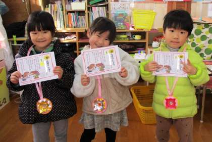 今日の対戦も「私、これ(絵札)大好き!だって(この文字)名前にあるもん」「ぼくは、これ(絵札)絶対取りたいから頑張る」と口にする子も多く、大変盛り上がりました。1回目、2回目を合計し1位から8位まで発表しました。接戦の戦いとなりましたが、友達の名前が呼ばれると、自分のことのように喜び拍手を送る友達もおり、とても温かい気持ちになりました。「あ〜楽しかった!」とかるた会後に呟く声も聞かれ、子供たちにとって、とても楽しい活動だったことが伺えました。