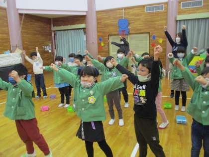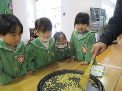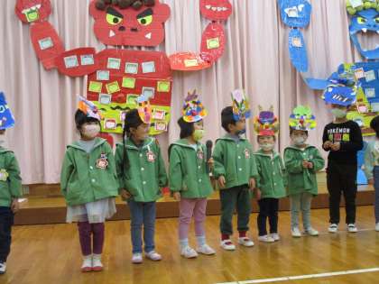 春を待つ子ども会(全年齢)パート1 公開日 2023/02/03 更新日 2023/02/03 今日のできごと 2月3日(金) 今日は春を待つ子ども会。朝から鬼の苦手なひいらぎと鰯の飾りを飾ったり、豆を炒ったりしました。子ども会では、節分の由来について話を聞いたり、自分の追い出したい鬼やつくった鬼のお面を発表したり「♪鬼のパンツ」「♪豆まき」を歌ったりして楽しみました。