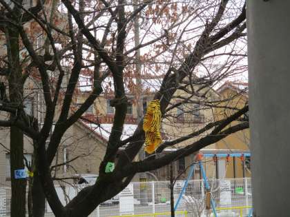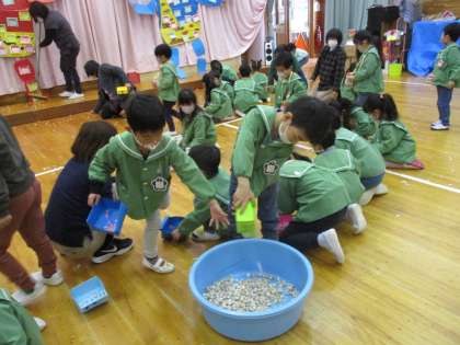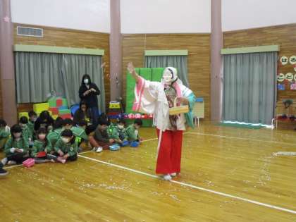 みんなで力を合わせて鬼を追い出すと、どこからかきれいな琴の音色が聞こえてきました。すると、福の神が来てくださり、春の訪れと幸せを運んでくれました。鬼が来て不安そうにしていた子供たちも福の神から幸せと美味しいお菓子をもらい、嬉しそうにしていました。みんなで遊戯室の豆を拾い片付けた後、保育室に戻ると園庭の桜の木に鬼のパンツが!子供たちは「鬼さん慌てて帰ろうとしてひっかかったのかな?」「忘れた鬼のパンツ!取りにくるかも?」「嫌だ!怖いよ…」「また来ても豆を投げて追い出せるから大丈夫」と話していました。