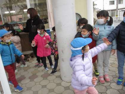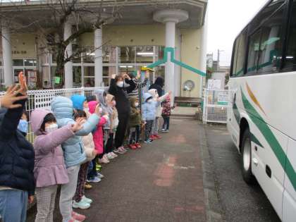 ぞう組とのお別れ遠足が延期になり、今日は『なかよし遠足』として、りす組とうさぎ組で北陸電力エネルギー科学館や富山駅周辺へ出かけました。ぞう組はまだ全員登園しておらず、今日はりす組とうさぎ組を見送りました。バスに乗る前に「いってらっしゃーい!」とハイタッチするぞう組。手を振りながら「いいな…」とポツリ話していて「「ぞう組さんは今度、皆が揃ったら速星駅から電車に乗って富山駅に行くよ〜」と話すと「やった!」と喜ぶ姿が見られました。