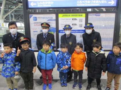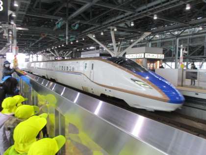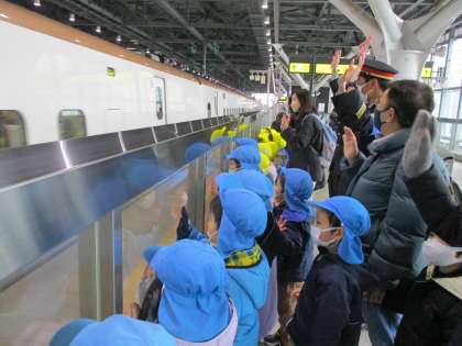 お客さんの乗り降りだけでなく、進行方向が変わる際に、座席が自動で動くところも見ることができ、貴重な見学でした。駅員の皆さん、子供たちが安全に見学できるようサポートくださりありがとうございました。また、新幹線に乗車されていた方にもたくさん手を振っていただき、嬉しかったですね!