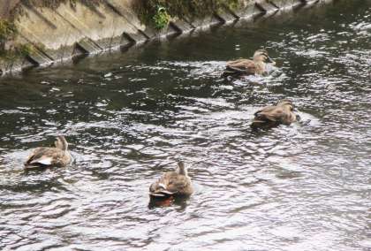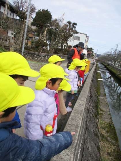 坪野川沿いに歩いていると、赤や黒、白の鯉が泳いでいるのが見えました。身を寄せ合うようなたくさんの鯉に子供たちも喜んでいました。しばらく歩くと今度はカモの群れに出会い、驚かせないようにそーっと近付いて見てきました。公園に立ち寄り休憩したり遊んだりして約1時間弱の散歩となりました。知っている店の看板や見覚えのある道路を見ると「買い物に行ったことあるよ」「僕の家はこっちに曲がるとあるよ」と教えてくれた子もいます。歩きながらのお喋りもにぎやかで、疲れも見せずに歩く姿からも成長を感じることができました。