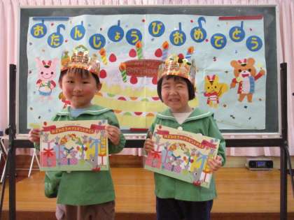 今日は2月生まれの誕生会があり、2名の友達をお祝いしました。質問コーナーでは「好きな公園はどこですか?」の質問に、周りにいた子は「難しいな」と話していましたが、誕生児の友達は「ピースフル公園です」と考えて答えていました。