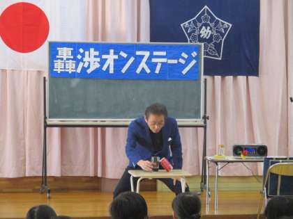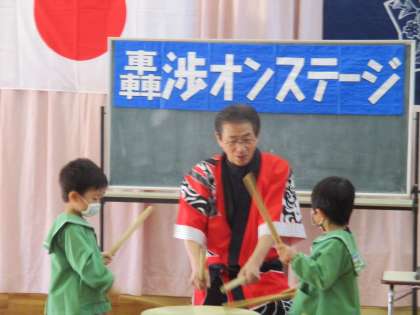 お楽しみ会では、シンガーソングライターの轟渉さんが来てくださり、手品や和太鼓を披露してくださいました。手品では、コインや風船、水の色が変わる手品があり、中でもジュースが入った缶が傾いたまま立っていると「え!どうして!」「不思議、すごい!」と歓声が上がりました。和太鼓では、初めて見た子も多く、大きな音に驚く姿が見られました。轟さんの厚意で子供たちは和太鼓を体験させてもらいました。和太鼓の音や叩いたときの振動を体で感じることができ「音が大きくてびっくりしたけど、またやってみたい」と興味をもつ姿が見られました。