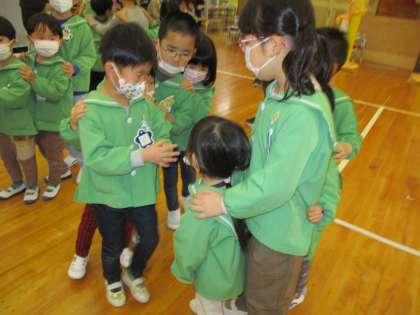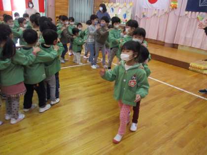 次は、ゲームでじゃんけん列車とナンバーコールをしました。じゃんけん列車では、じゃんけんに勝った友達が先頭になり、続けていくとどんどん長い列車ができるゲームです。子供たちは、じゃんけんに勝っても負けても友達とつながることを楽しんでいました。