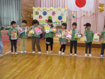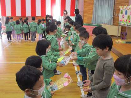 お別れ会 パート4 公開日 2023/03/09 更新日 2023/03/09 今日のできごと お別れ会の最後は、ぞう組さんにお礼のプレゼントを渡しました。気持ちのこもったプレゼントにぞう組さんは喜んでいて、その姿を見てりす組やうさぎ組さんも嬉しそうでした。みんなで花道をつくってぞう組さんを見送りました。