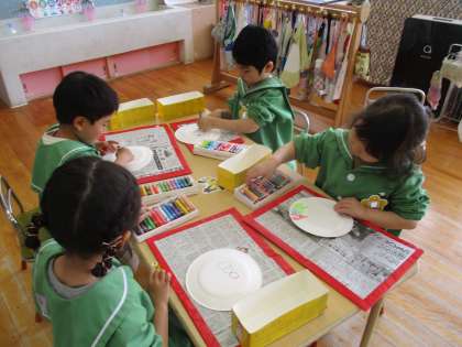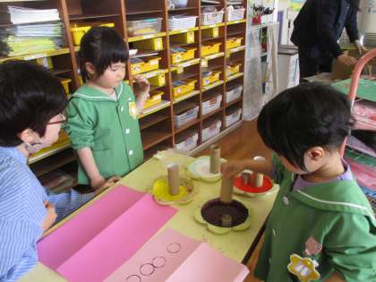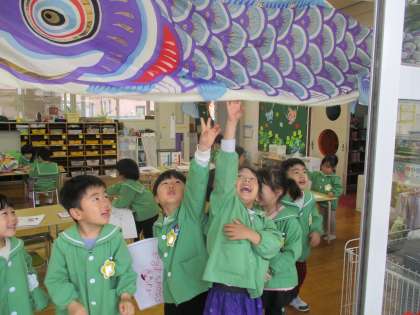 良い天気になったので、ぞう組さんが園庭にこいのぼりを上げてくれました。「わー大きい!」「黒と赤と緑のこいのぼりだね」と話をするうさぎ組さん。お部屋にもこいのぼりを飾り、親しんでいます。紙芝居で、こいのぼりを飾る由来を知らせると真剣に聞く子供たちでした。「自分のこいのぼりをつくろう」と話をし、絵の具をつけたビー玉を転がしたり、スタンプをしたりして素敵な模様になりました。出来上がりが楽しみです。