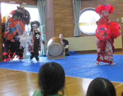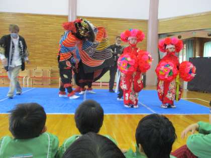速星地区の春の祭りで、地域の獅子舞の方々が幼稚園にもきてくださいました。