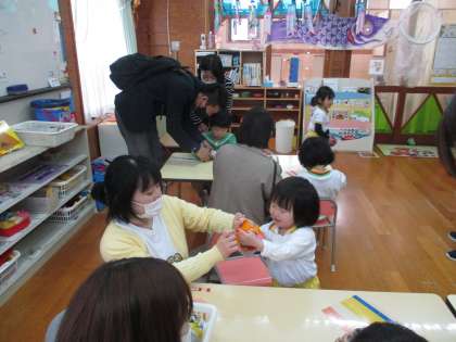 入園して初めての保育参観がありました。前半に学級懇談会で園の教育目標や幼児にとって遊びは学びということを大事に保育していきたいことを話し、担任からは、入園してからの子供たちの様子を伝えました。保護者同士も紹介をし、顔見知りになれたのではないかと思います。