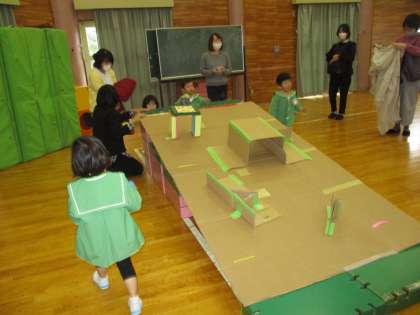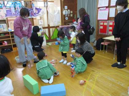 後半は朝の集まりで名前を呼ばれると大きな声で返事したり、歌を歌っているところを見てもらいました。お家の人が見ていて少し緊張もするのかなと思いましたが、笑顔が見られ、楽しそうに歌っていた子供たちでした。その後、お家の人と一緒に新聞ボールを作って坂道を転がしたり、的あてをしたりして遊びました。子供たちは「やってみよう」と遊びを選び楽しむ姿が見られました。遊んでいる姿を見て保護者の皆さんも少し安心できたのではないかと思います。