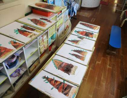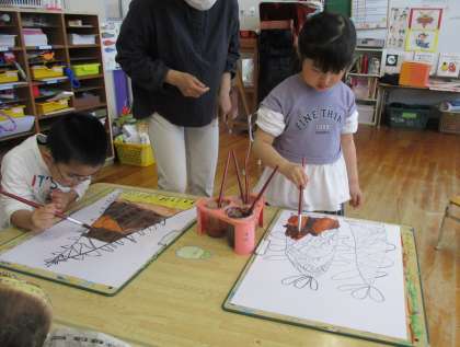 筍を見てどんな色に見えるかを考え,絵の具で色を塗りました。友達が塗っている様子を見て早く自分もやりたいと気持ちを伝えてくる友達もいましたよ。それぞれの見え方がとても素敵な筍の観察画になりました。