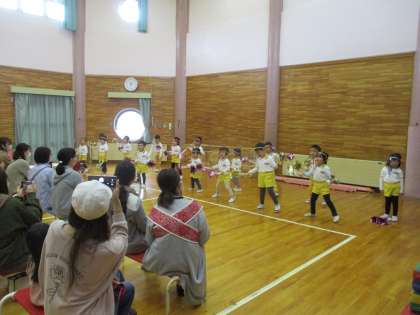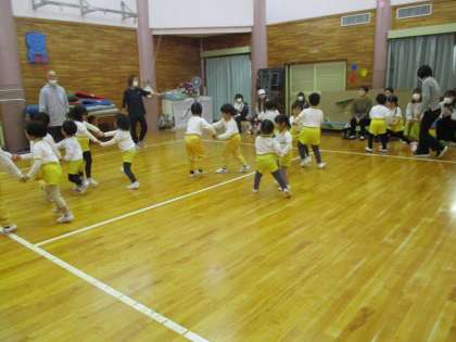 うさぎ組になって初めての保育参観がありました。数日前からお家の方が来てくれることを楽しみにしていた子供たち。朝の集まりでは、緊張した様子も見られましたが、話をしている人の方に体を向けて話を聞いたり、元気に歌を歌ったりなど普段の姿を見ていただくことができました。体操教室では、指導員の先生の話をよく聞き、元気に体動かして遊びました。ケンケンやカエルジャンプなど、1人で色々な運動遊びをした後、ペアになって、カニさん歩きやメリーゴーランドをしました。「一緒にやろう」と友達に声をかける素敵な姿も見られましたよ。そのあと、入園式の歓迎会で踊ったマツケンサンバを披露し、お家の方から拍手をいただき、嬉しそうな子供たちでした。