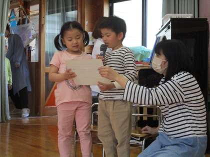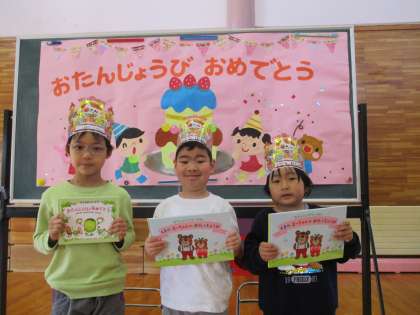 今日は、4月生まれの誕生会を行いました。ぞう組の係の友達が司会をし、3人の友達をみんなでお祝いしました。インタビューコーナーでは、好きなポケモンや好きな動物を聞かれ、それぞれ自分の好きなものを考えて答えていましたよ。