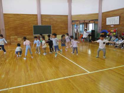 お楽しみコーナーでは、リトミック講師の塩川先生をおよびし、ピアノの音に合わせて体を動かして遊びました。音の高さやリズムに合わせて、走ったり歩いたり手拍子をしたり…ピアノの音に自然と体が動き、のびのびと全身を使い表現することを楽しむ子供たちでした。