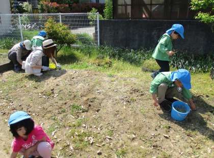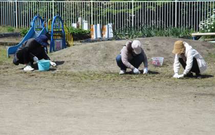 昨日、今日の2日間はPTA除草の日で、登園時や降園時の保護者の方の都合のいい時間帯に園庭の草むしりをしてくださいました。持ち物の始末が終わった子供たちも一緒に草むしりをして、みんなできれにしました。バケツにいっぱいになった草を集めて捨てに行ったり「よいしょ」と草を引っ張ったら尻もちをついてしまい笑ったり、親子で和やかな時間となり園庭もきれいになりました。保護者の皆様、ご参加くださりありがとうございました。