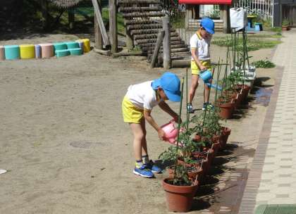先週植えた野菜の水やりに登園後の持ち物の始末が終わると部屋をとびだしていく子供たちです。長寿会の方に教わった「なるべく早い時間帯にあげよう」と急ぐ子もいます。また「のどが渇いてるかな」と土の状態を見て考えられるよう投げかけています。