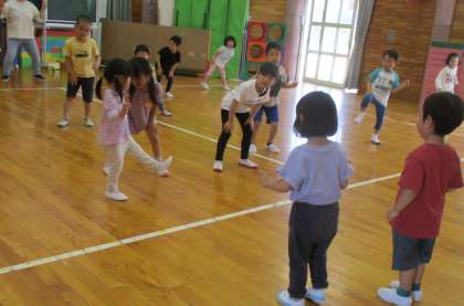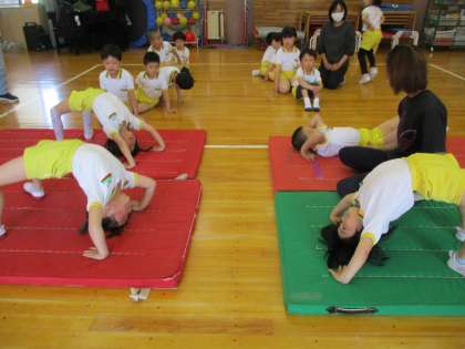 今日の体操教室では、前転、開脚前転の後「ブリッジ」に挑戦しました。腕の力が必要なことはもちろんですが、どの方向に力を入れるかを考えることで繰り返す中で自力でできた子もいました。腕の置き方や力の入れ方等の感覚を掴んでほしく、午後には振り返りながら再度練習しました。りす組の友達が何をしているのかな?と顔を出して見にきてくれたので、一緒に体操もしました。散歩で一緒に歩いた友達の近くに自然に歩み寄ったり声をかけたりしていて関係が築かれてきていることを嬉しく思っています。