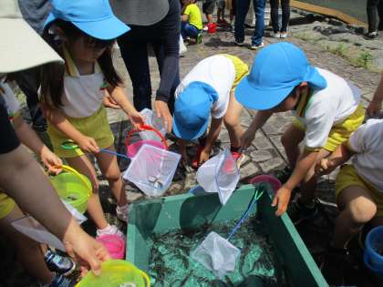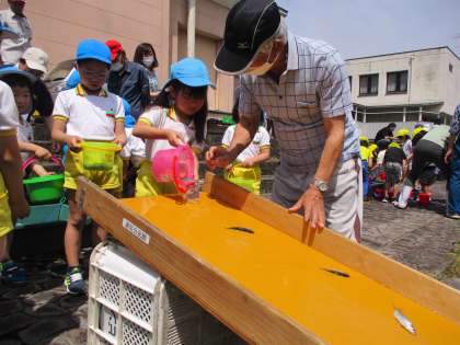 婦中地区ふれあい体験 稚鮎放流(5歳児)