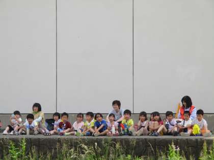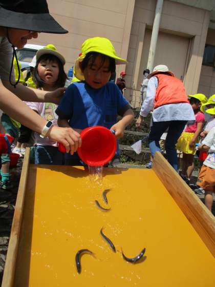 今日は、年長さんの稚鮎放流では、どんなことをするのかな?と、うさぎ組で見学に行ってきました。川の対面側から見ていた子供たちは「あ、流れていった」「元気でね〜」と、放流される姿を見ていました。地区の方のご厚意で、見学していた子供たちにも「どうぞ」と言ってくださり、一人ずつ放流体験をさせていただきました。思いがけない体験に子供たちも大喜びでした。