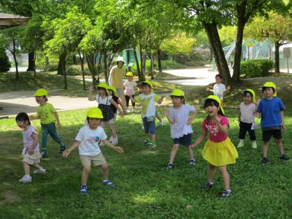 稚鮎放流のあとは、スポーツプラザで遊んできました。「だるまさんがころんだ」では、真剣な顔で止まっていて、気持ちのいい木陰で楽しむことができました。