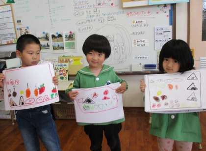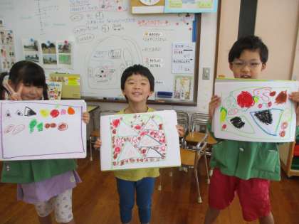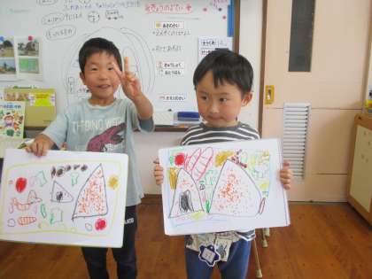 明日遠足を前に天気が気になる子供たちでしたが、予報では晴れ!「おとぎの森公園」の大型遊具で遊べることに大喜びの子供たちです。今日は、明日の持ち物や集合時間の確認をした後、遊ぶ次に楽しみにしている「お弁当」の絵を描きました。三角おにぎり、ウインナー、ブロッコリー、トマトはみんなで描き進め、自分の食べたいおかずや果物を描き加えました。ハンバーグ、から揚げ、アメリカンドッグ、さくらんぼ、いちごと子供たちの好きな物が続々!とてもおいしそうで、少し欲張りな弁当になりましたが、子供たちの期待がたくさん詰まった楽しい活動になりました。